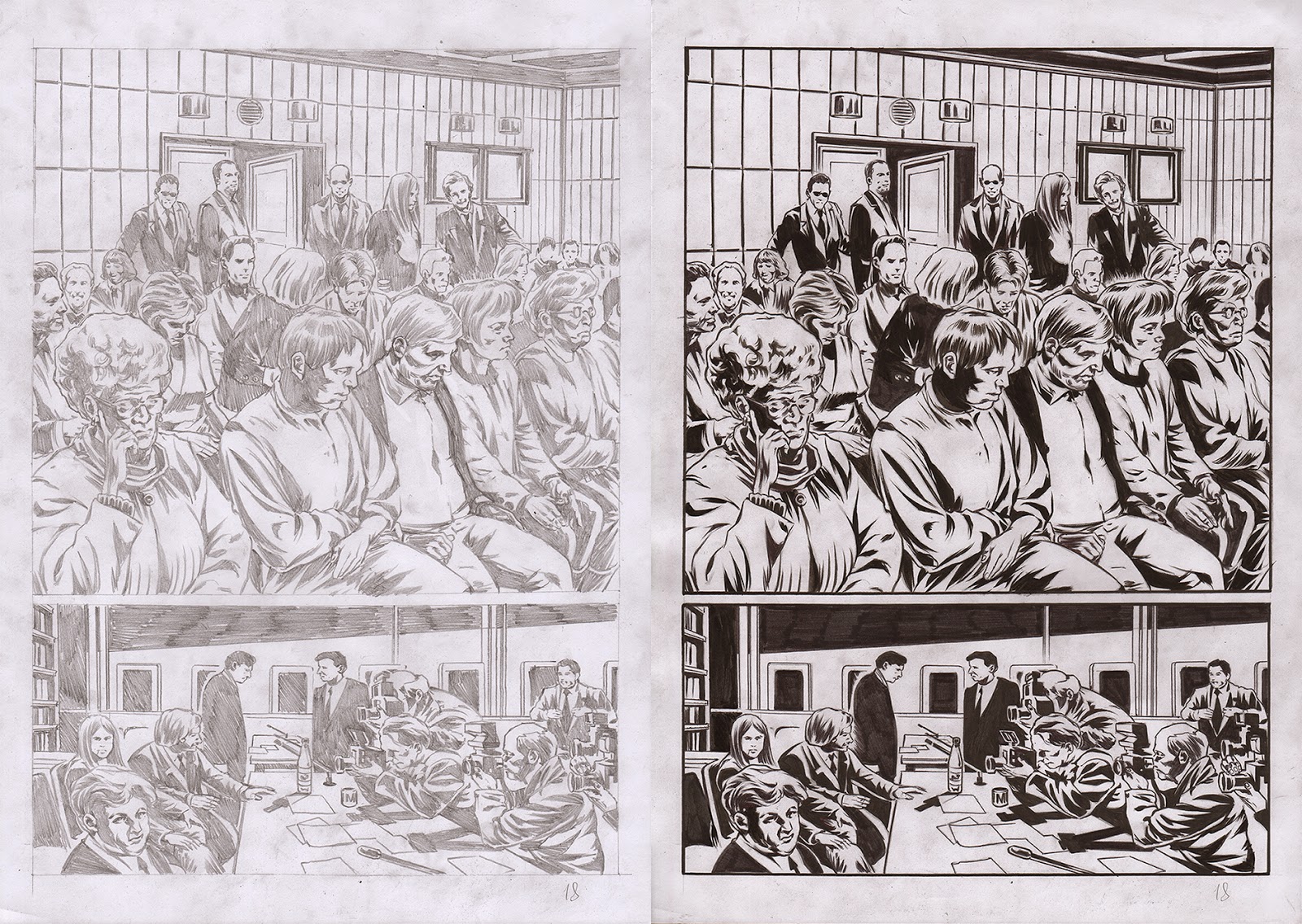 Si tratta di un approccio valido, come qualsiasi altro, ma molto dispendioso; soprattutto quando, in un fumetto, la matita va inchiostrata, sovrapponendo una sintesi (stavolta s) ad un disegno magari gi completo. Ci vengono in aiuto le tavole postate dallo stesso autore, nelle quali si vede la differenza fra matita e china per la stessa tavola. Qui, alla perizia nel disegno e nella prospettiva, aggiungiamo anche la qualit dell'inchiostrazione, classicissima come nei fumetti che tutti hanno amato (i classici nomi statunitensi) ma spinta in maniera molto decisa verso una plasticit molto marcata; pochissimi tratteggi e sempre il nero e il bianco ad alternarsi, in un violento scontro fra opposti, in piena sintonia con la spiazzante crudezza del racconto.