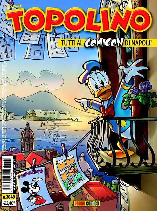 In particolare, non possiamo evitare di citare la particolarissima copertina del Topolino della settimana prossima, in edicola dal 30 aprile. Realizzata da Blasco Pisapia (disegno) e Mirka Andolfo (colori), incita i lettori a recarsi in massa al XVI festival partenopeo Napoli COMICON, in particolare nell’area Panini che lancia questo Topolino e una nuova pubblicazione, con la presenza del suo sceneggiatore Massimo Marconi.